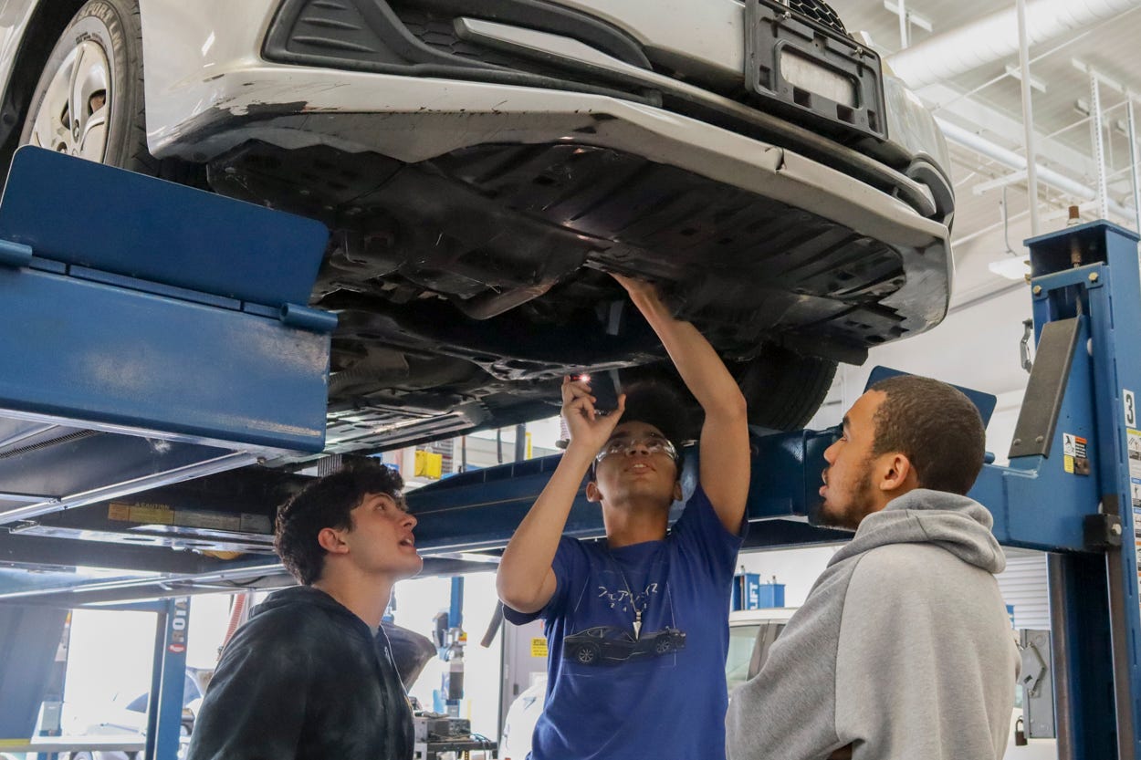 (L-R) El Camino College automotive tech students, Atilla Gahbro (21), Jackson Culella (20), and Charles Anderson (18) work together to diagnose the HVAC system on a Honda Civic for their auto-tech class on Monday, June 2. (Eddie Inclan | The Union)