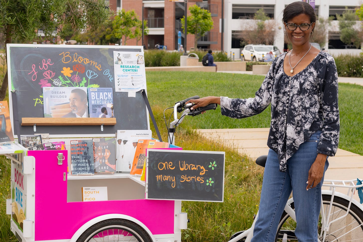 El Camino College Librarian Linda Cooks operates the ECC Book Bike in the Student Services Plaza on Wednesday, June 4. The Book Bike is a converted ice cream bike and is displayed in the Schauerman Library lobby when not at events (Katie Gronenthal | The Union)